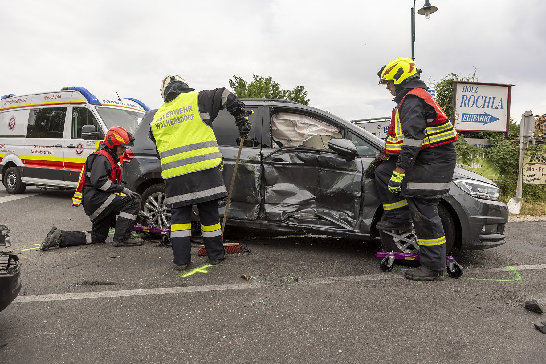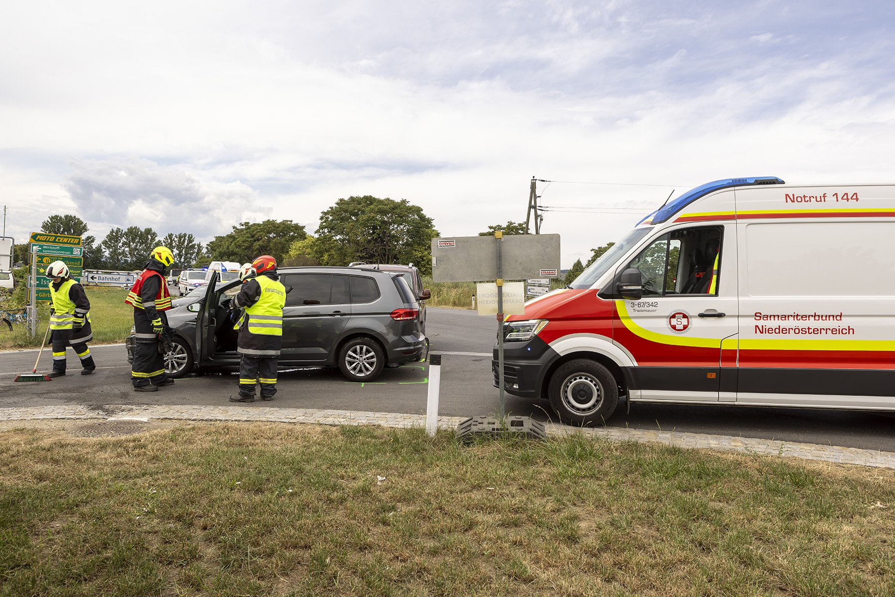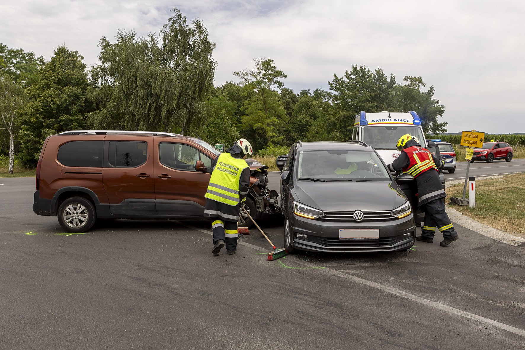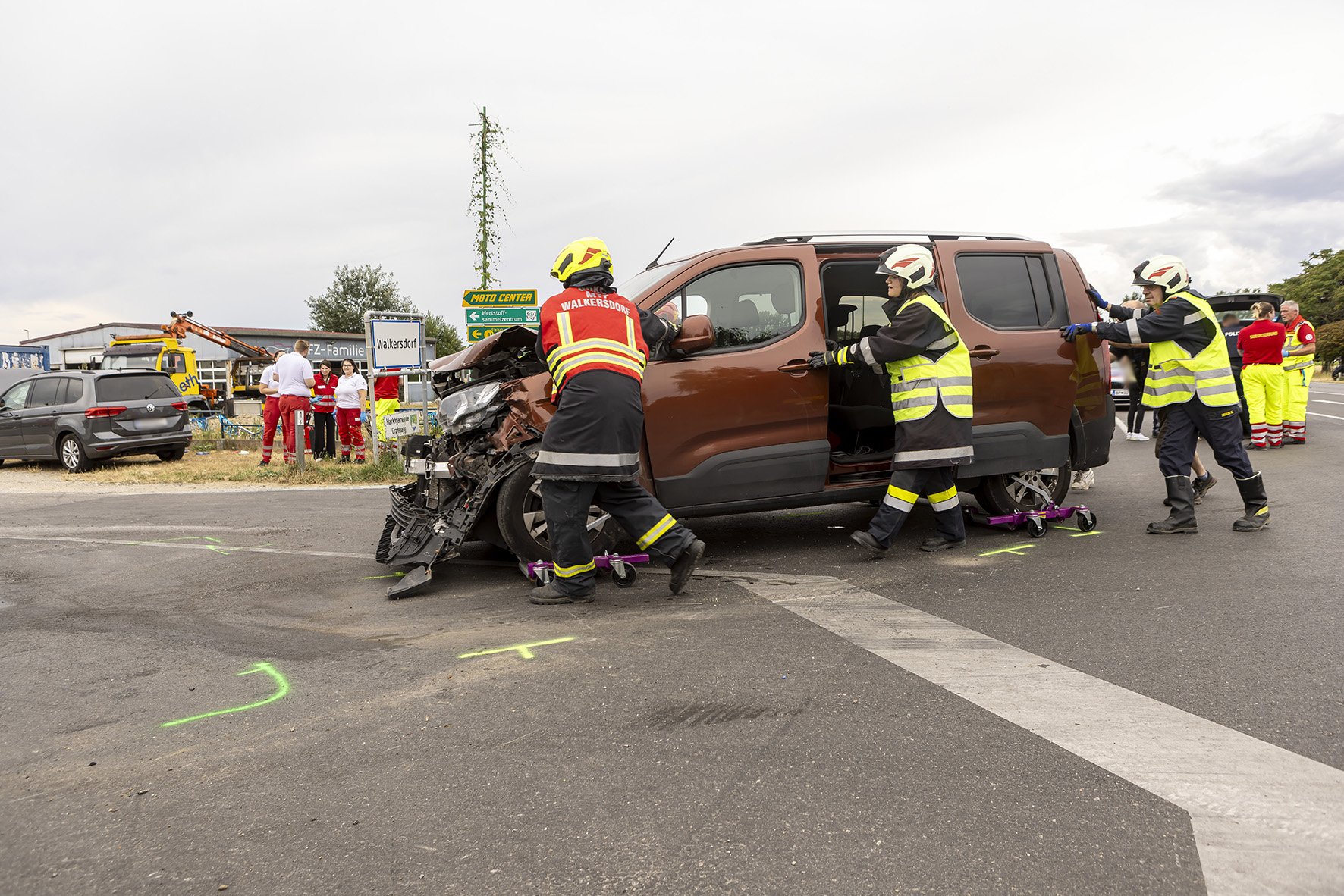 Die Freiwillige Feuerwehr Walkersdorf wurde heute, den 21. Juli 2023 um ca. 13:40 Uhr zu einem Verkehrsunfall zur B34 Kreuzung Gewerbegebiet alarmiert. Sofort machte sich die Mannschaft mit dem KLF und dem MTF auf den Weg zum Einsatzort. Da bei der Alarmierung bereits bekannt war, dass es 6 Verletzte, davon 3 Kinder, gibt, bereitete sich die Mannschaft auf der Anfahrt auf die Situation vor. Dort angelangt, zeigte sich dem Einsatzleiter und dem Gruppenkommandanten folgendes Szenario: 2 PKW im Kreuzungsbereich der B34 nach einem seitlichen Frontalcrash. Gleichzeitig trafen die alarmierten Rettungswägen und der Notarzt Krems ein, ebenso landete der Christophorus 2. Seitens der Feuerwehr Walkersdorf wurde der Brandschutz aufgebaut, der Verkehr geregelt, die Unfallstelle gereinigt, auslaufende Flüssigkeiten gebunden und die Fahrzeuge verkehrssicher abgestellt. Die Mannschaft der Freiwilligen Feuerwehr Walkersdorf konnte nach einer Stunde wieder ins Feuerwehrhaus einrücken.