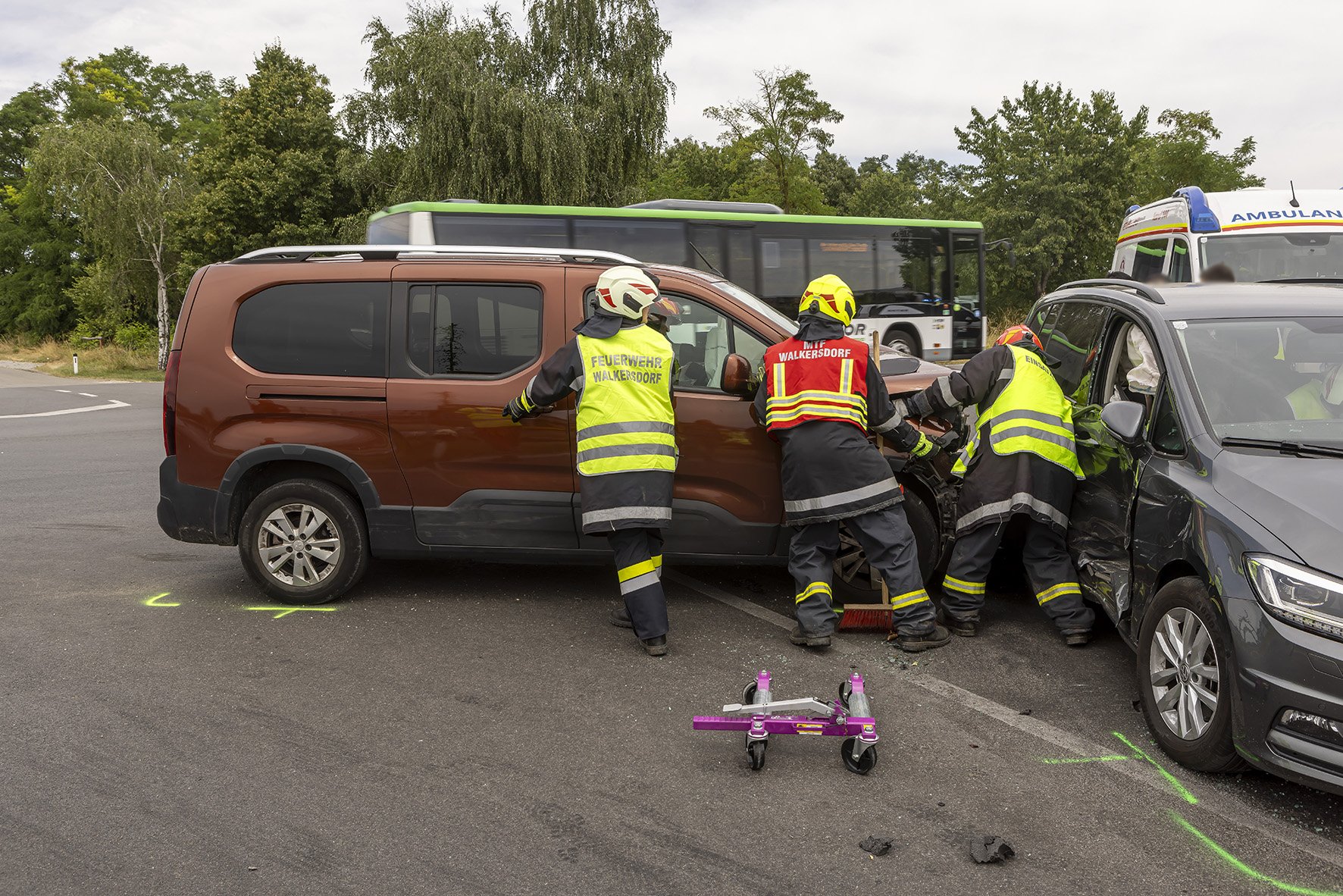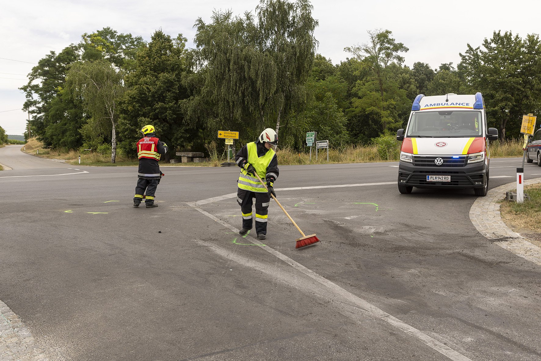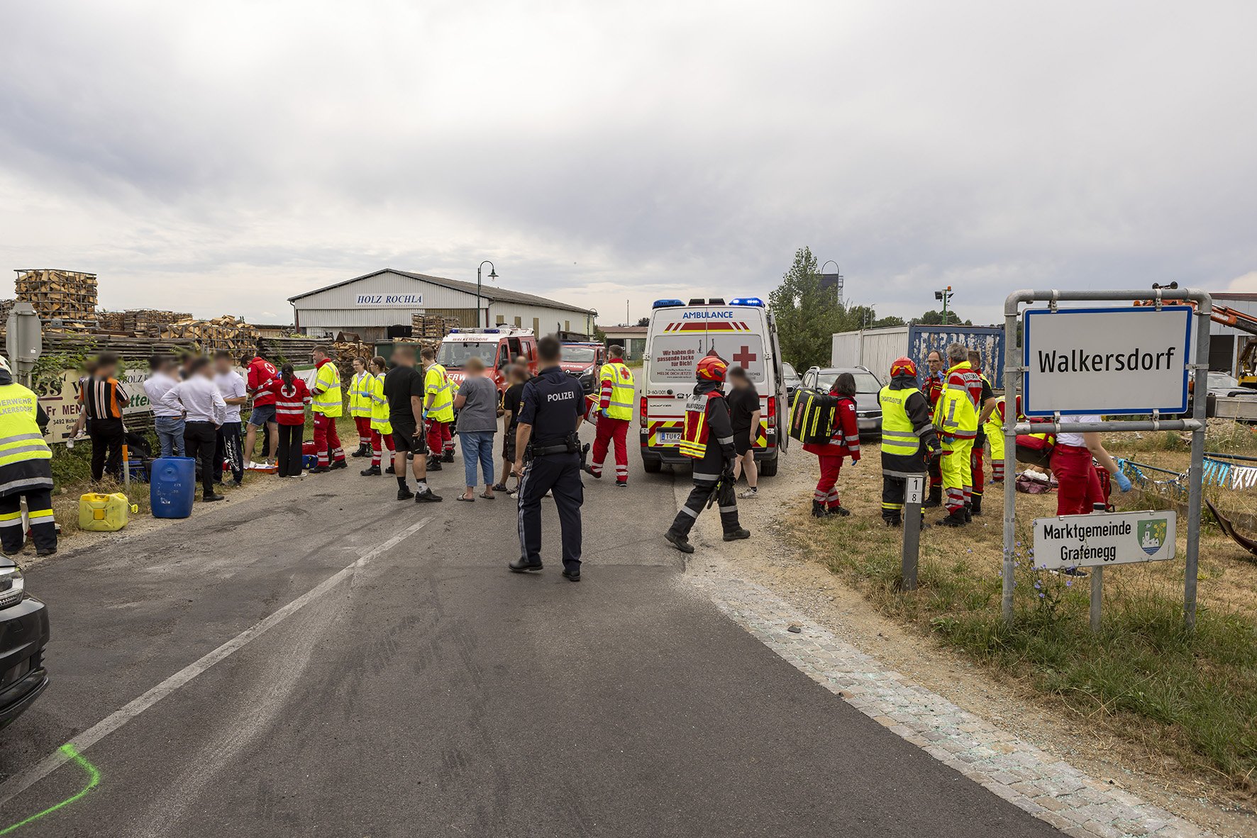 Die Freiwillige Feuerwehr Walkersdorf wurde heute, den 21. Juli 2023 um ca. 13:40 Uhr zu einem Verkehrsunfall zur B34 Kreuzung Gewerbegebiet alarmiert. Sofort machte sich die Mannschaft mit dem KLF und dem MTF auf den Weg zum Einsatzort. Da bei der Alarmierung bereits bekannt war, dass es 6 Verletzte, davon 3 Kinder, gibt, bereitete sich die Mannschaft auf der Anfahrt auf die Situation vor. Dort angelangt, zeigte sich dem Einsatzleiter und dem Gruppenkommandanten folgendes Szenario: 2 PKW im Kreuzungsbereich der B34 nach einem seitlichen Frontalcrash. Gleichzeitig trafen die alarmierten Rettungswägen und der Notarzt Krems ein, ebenso landete der Christophorus 2. Seitens der Feuerwehr Walkersdorf wurde der Brandschutz aufgebaut, der Verkehr geregelt, die Unfallstelle gereinigt, auslaufende Flüssigkeiten gebunden und die Fahrzeuge verkehrssicher abgestellt. Die Mannschaft der Freiwilligen Feuerwehr Walkersdorf konnte nach einer Stunde wieder ins Feuerwehrhaus einrücken.