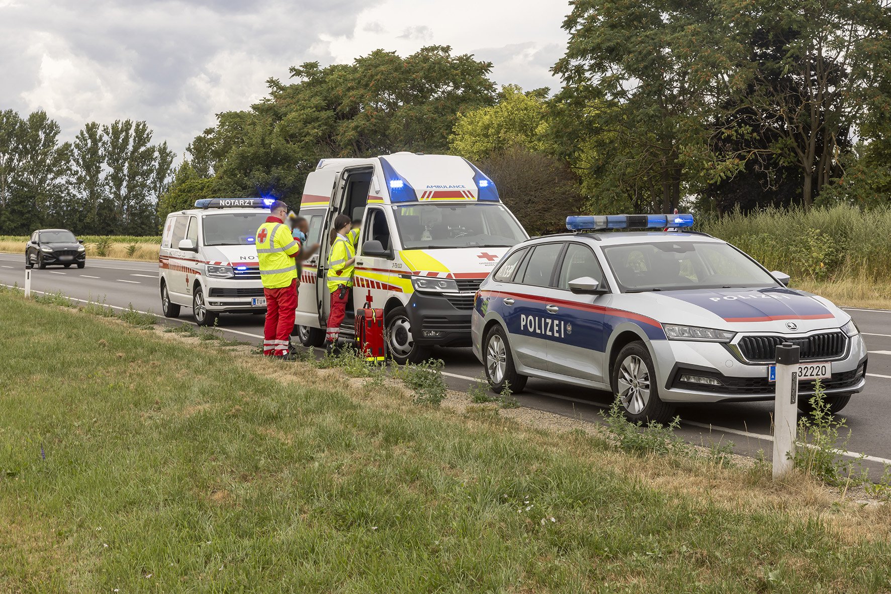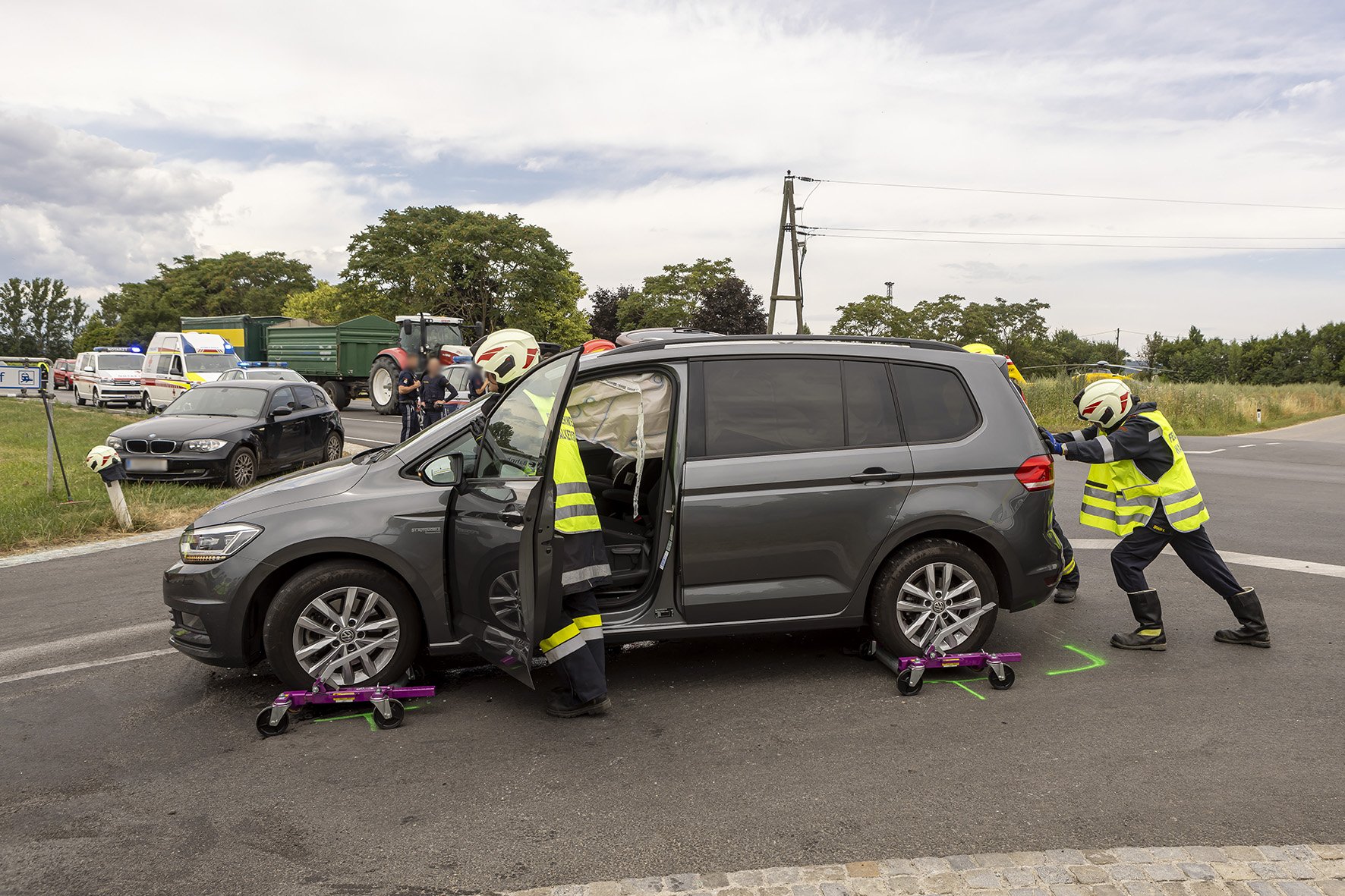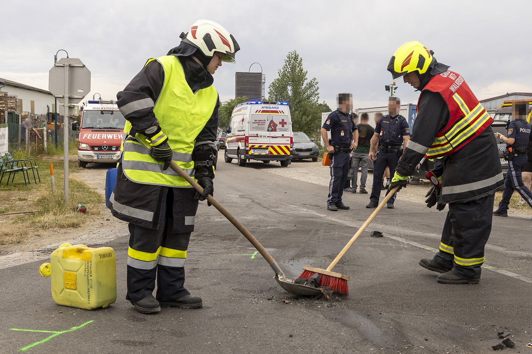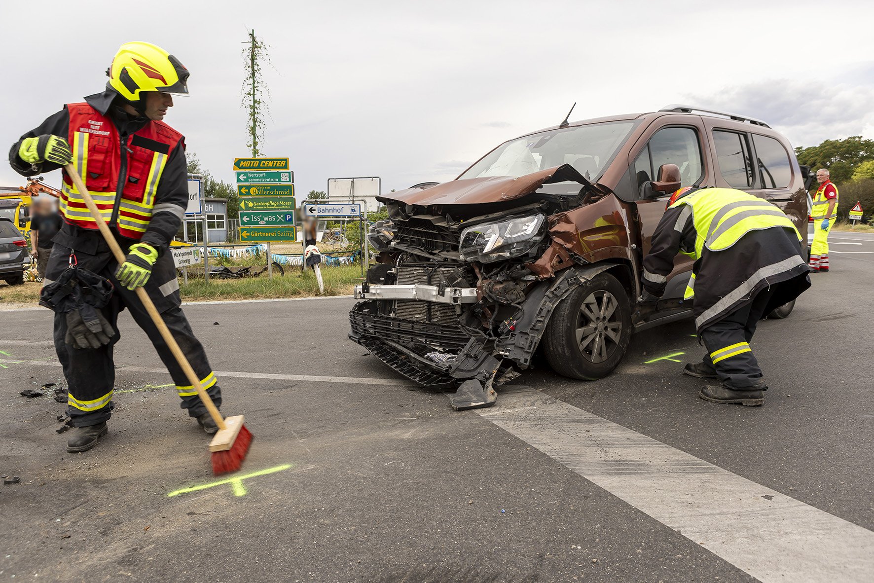 Die Freiwillige Feuerwehr Walkersdorf wurde heute, den 21. Juli 2023 um ca. 13:40 Uhr zu einem Verkehrsunfall zur B34 Kreuzung Gewerbegebiet alarmiert. Sofort machte sich die Mannschaft mit dem KLF und dem MTF auf den Weg zum Einsatzort. Da bei der Alarmierung bereits bekannt war, dass es 6 Verletzte, davon 3 Kinder, gibt, bereitete sich die Mannschaft auf der Anfahrt auf die Situation vor. Dort angelangt, zeigte sich dem Einsatzleiter und dem Gruppenkommandanten folgendes Szenario: 2 PKW im Kreuzungsbereich der B34 nach einem seitlichen Frontalcrash. Gleichzeitig trafen die alarmierten Rettungswägen und der Notarzt Krems ein, ebenso landete der Christophorus 2. Seitens der Feuerwehr Walkersdorf wurde der Brandschutz aufgebaut, der Verkehr geregelt, die Unfallstelle gereinigt, auslaufende Flüssigkeiten gebunden und die Fahrzeuge verkehrssicher abgestellt. Die Mannschaft der Freiwilligen Feuerwehr Walkersdorf konnte nach einer Stunde wieder ins Feuerwehrhaus einrücken.