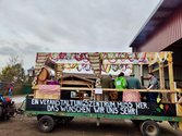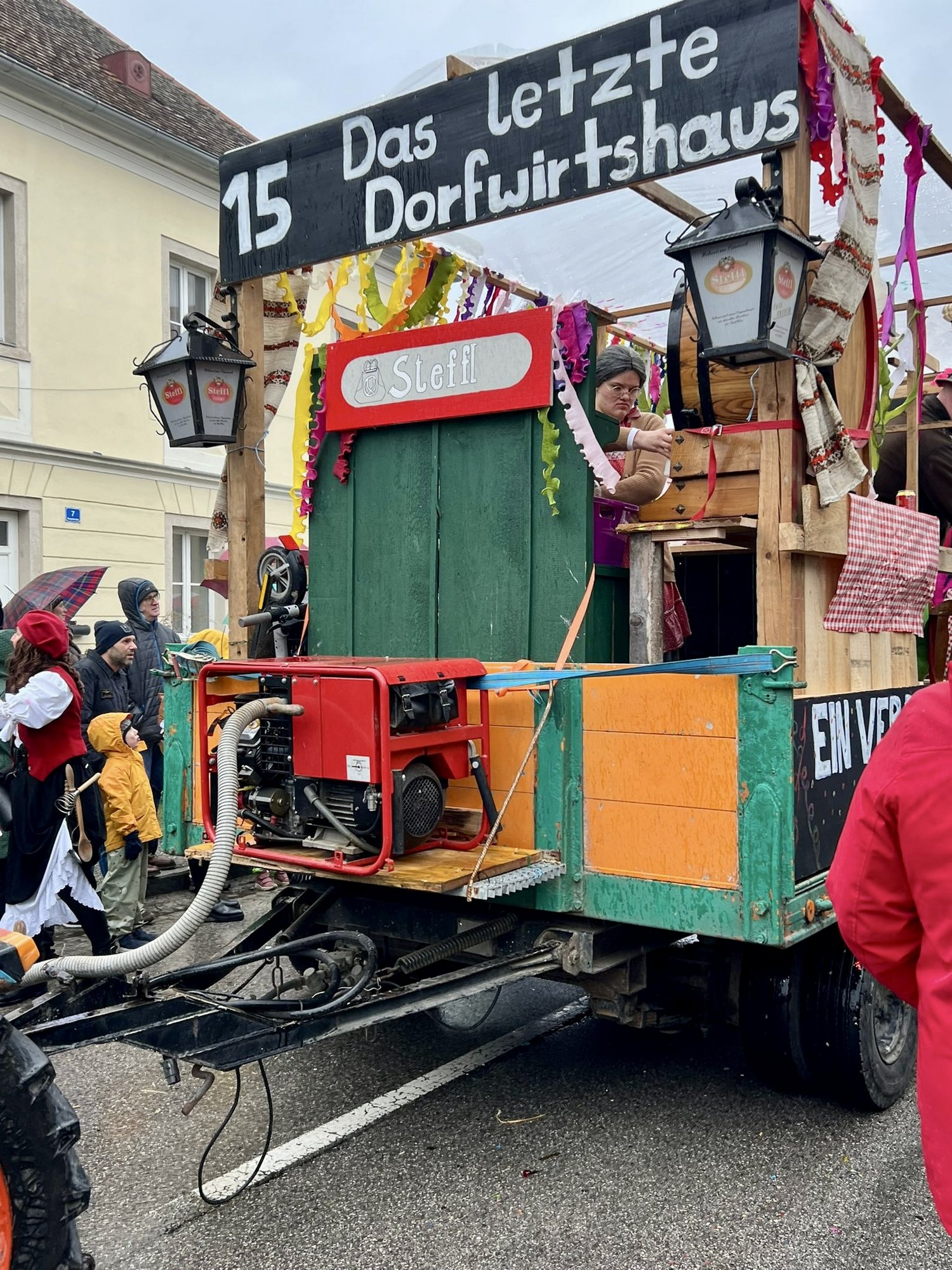 Neben der lustigen Verkleidung hatte die Feuerwehr Walkersdorf auch einen aufwändig gestalteten Faschingswagen dabei. Dieser stellte das Dorfwirtshaus in all seiner Pracht dar und wurde mit viel Liebe zum Detail gestaltet.