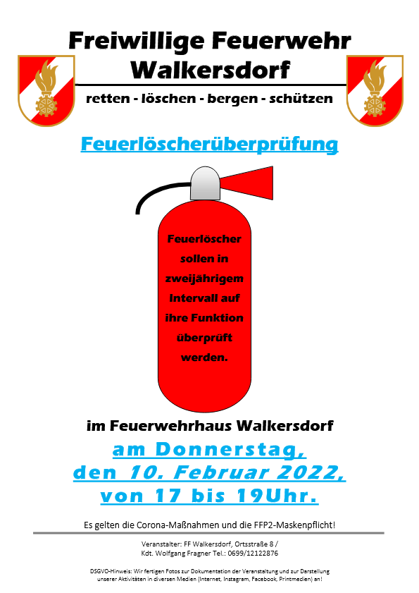 Deswegen boten wir am 10.Februar 2022 (den internationalen Tag des Feuerlöschers) von 17 bis 19 Uhr bei uns im Feuerwehrhaus in Walkersdorf Ihren Feuerlöscher überprüfen zu lassen an.
