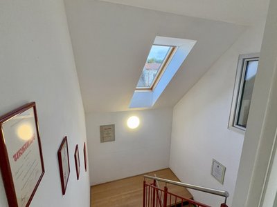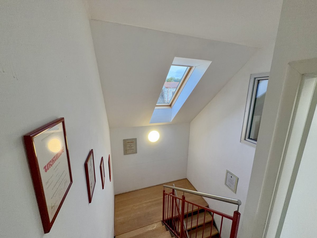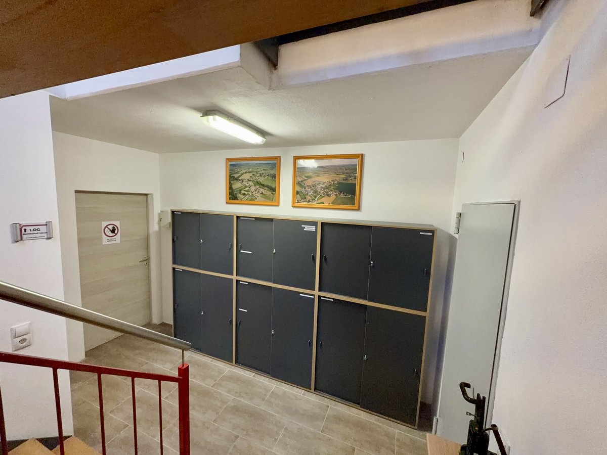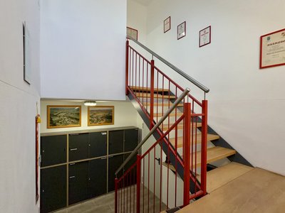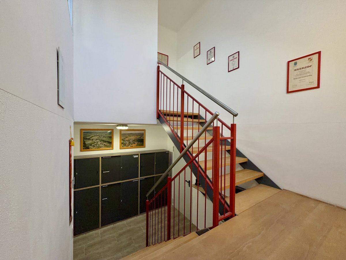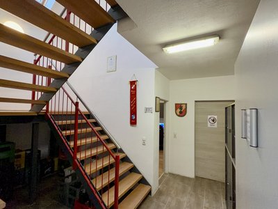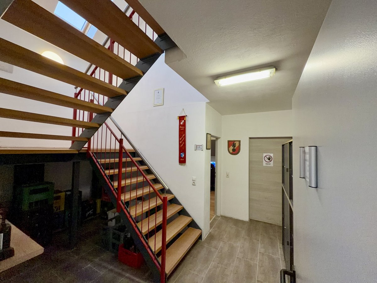Das Stiegenhaus ist die Verbindung zum Obergeschoss der Feuerwehr. In der Nähe des Aufganges befinden sich Aktenschränke, in diesem befindet sich die Dokumente und Aufzeichnungen der Feuerwehr Walkersdorf.