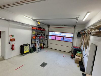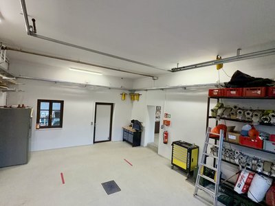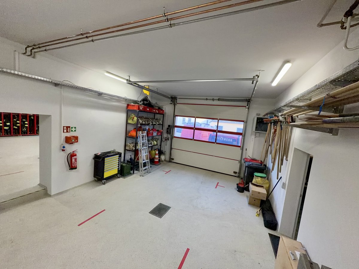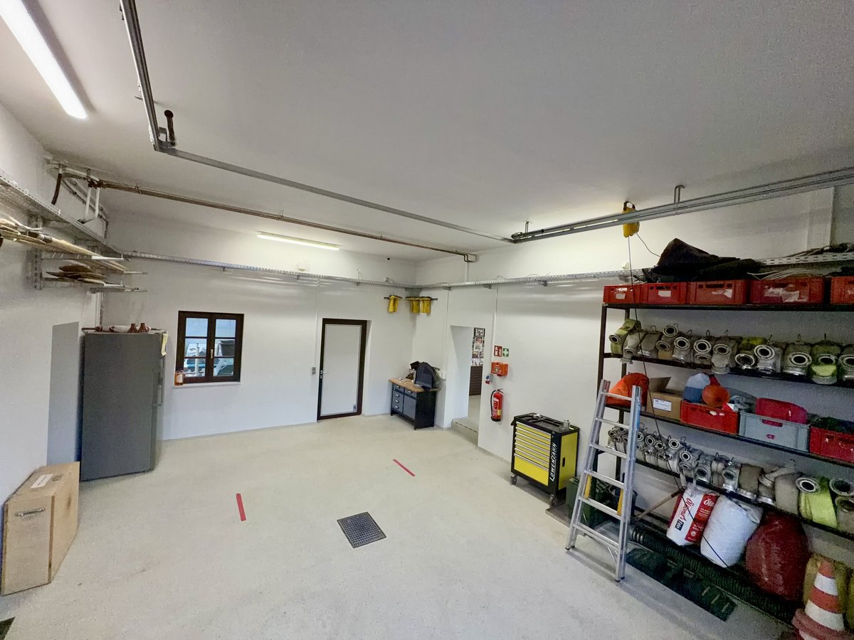 Das MTF ist in dieser Halle abgestellt. Seitlich an den Wänden stehen Regale. Dort lagern Werkzeuge für Reparaturen und zusätzliche Feuerwehrausrüstung wie zum Beispiel Schläuche in verschiedenen Dimensionen, Wasserführende Armaturen, diverse Bindemittel und noch einiges mehr. Ebenso ist eine Werkbank und ein moderner Serverschrank für unsere IT-Infrastruktur in dieser Halle. Damit ist eine stabile und sichere digitale Vernetzung gewährleistet.