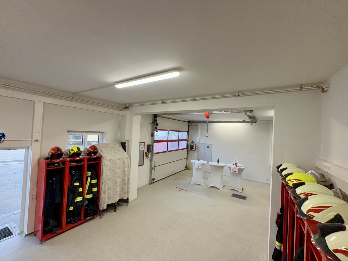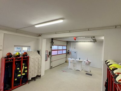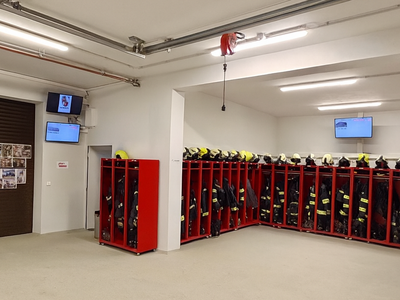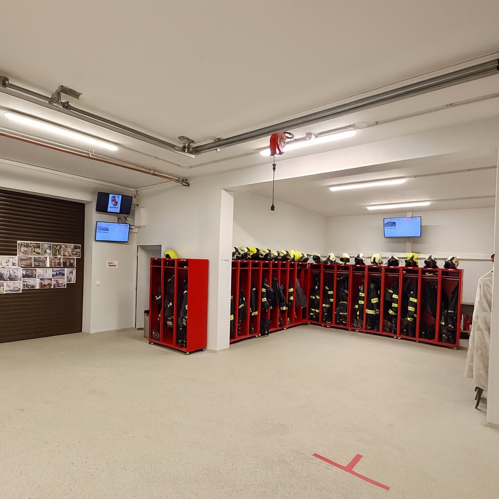 Unsere erste Halle ist nicht nur die Garage für unser KLF, sondern auch flexibel nutzbar – etwa für Schulungen, Sitzungen oder kleinere Feierlichkeiten. In den mobilen Bekleidungsspinden befindet sich für jedes aktive Mitglied seine Einsatzbekleidung griffbereit. Auf den ersten Blick fällt einem sofort auf, dass drei Bildschirme in der Halle hängen. Dies ist unser Info-Screen, welcher uns alle wichtigen Einsatzdaten (Wegbeschreibung, Alarmstufe und noch viel mehr) anzeigt. Zusätzlich ist an der Wand zur zweiten Halle die Sirenen-Fernsteuerung befestigt. Jene ist mit dem Tor verbunden und öffnet dieses automatisch bei einem Einsatz.