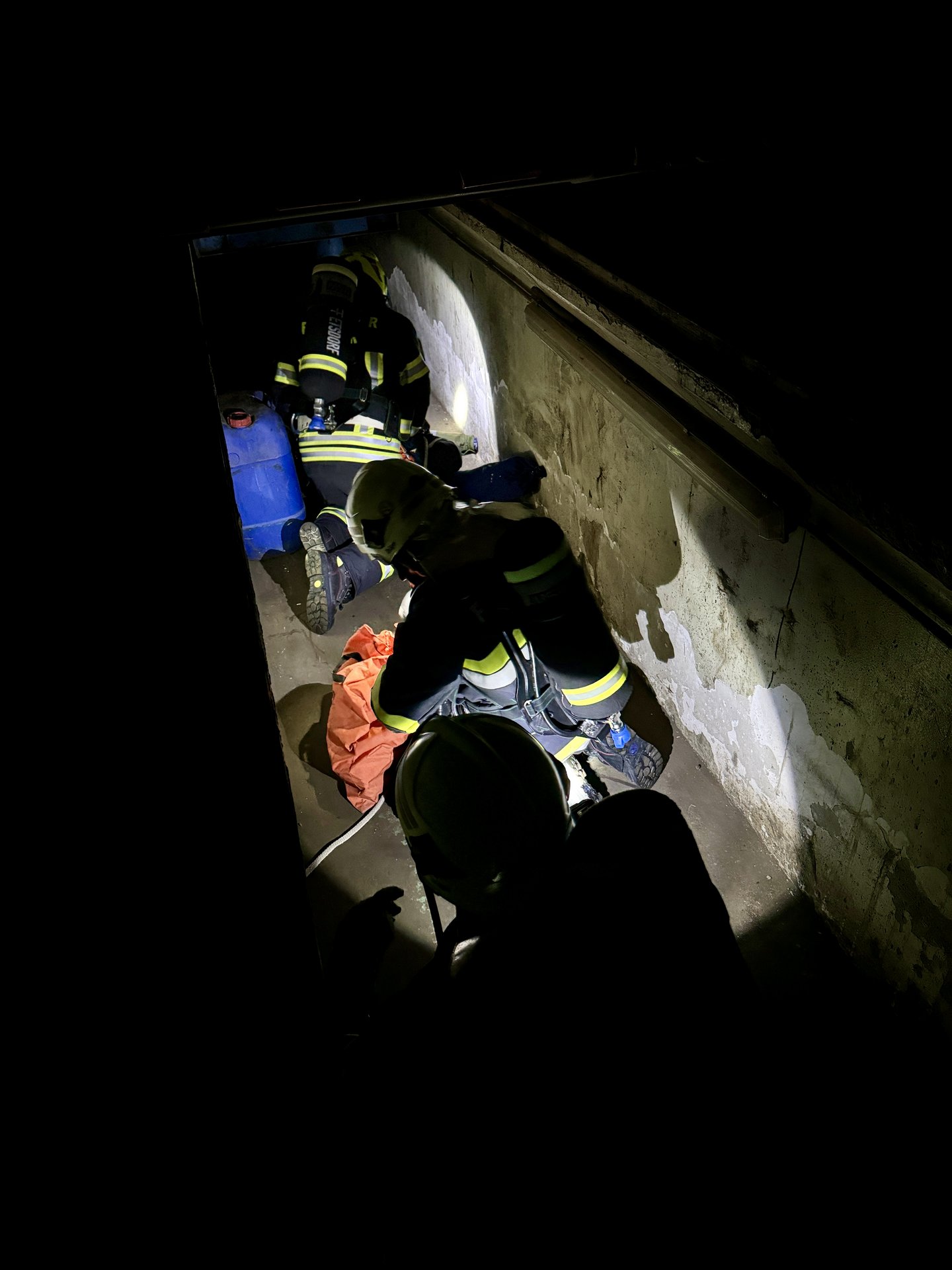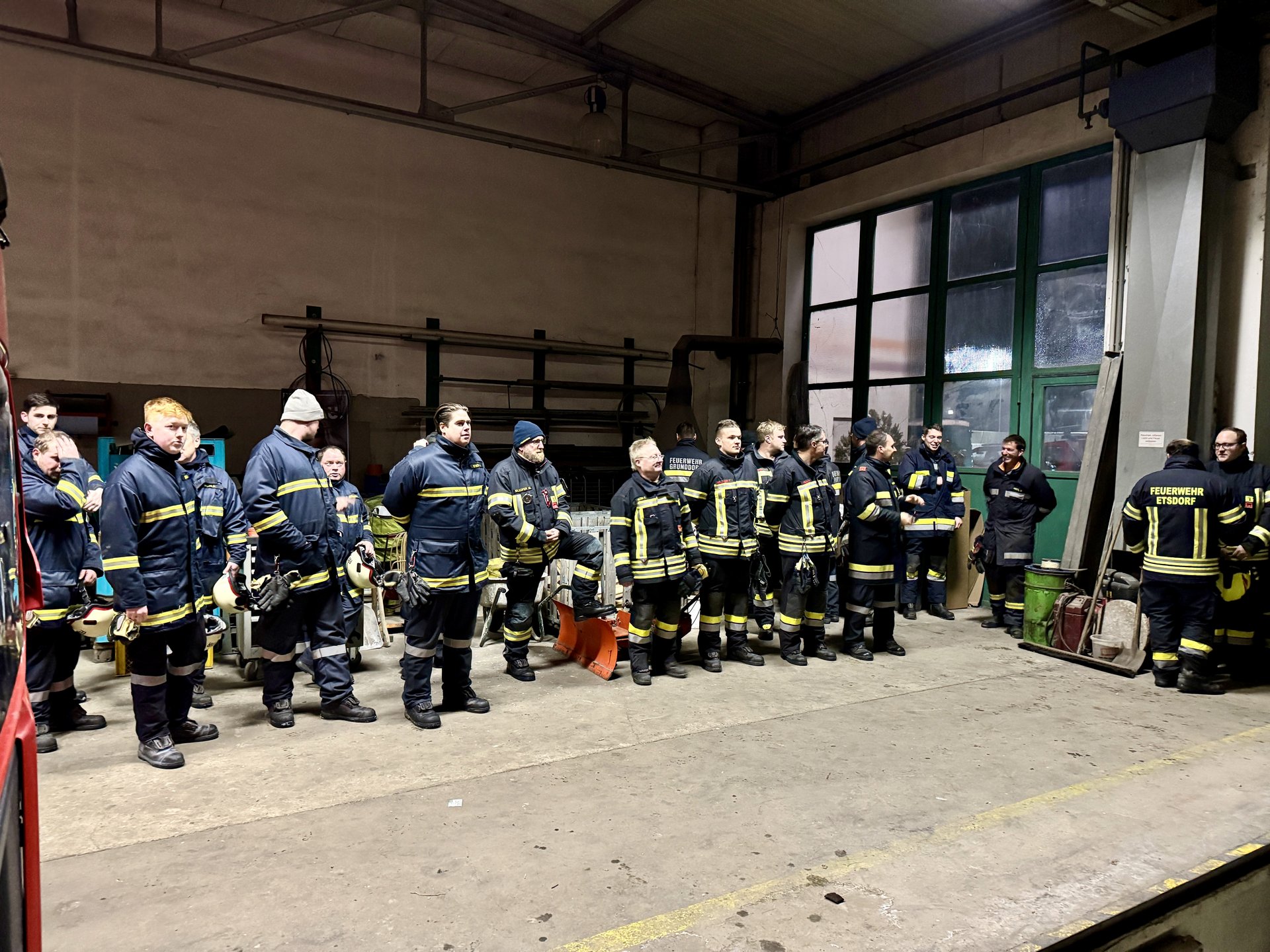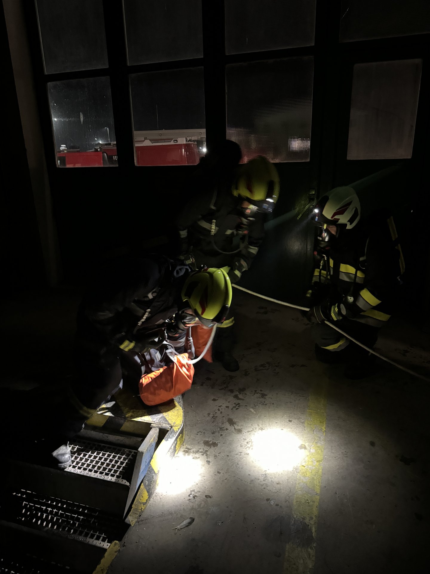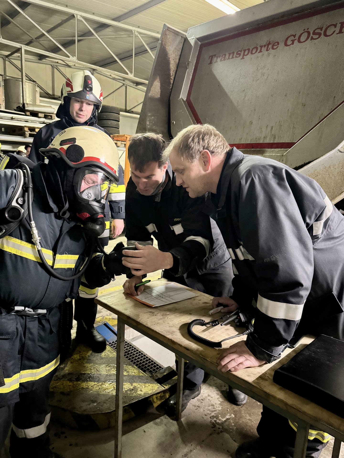 Übungsannahme war, dass in einer Wartungshalle ein Brand ausgebrochen ist und eine verletzte Person in der Montagegrube unter einem LKW vermutet wird. Die Feuerwehrleute mussten mit schwerem Atemschutzgerät ausgestattet, in das Gebäude vordringen, um die Person zu retten.