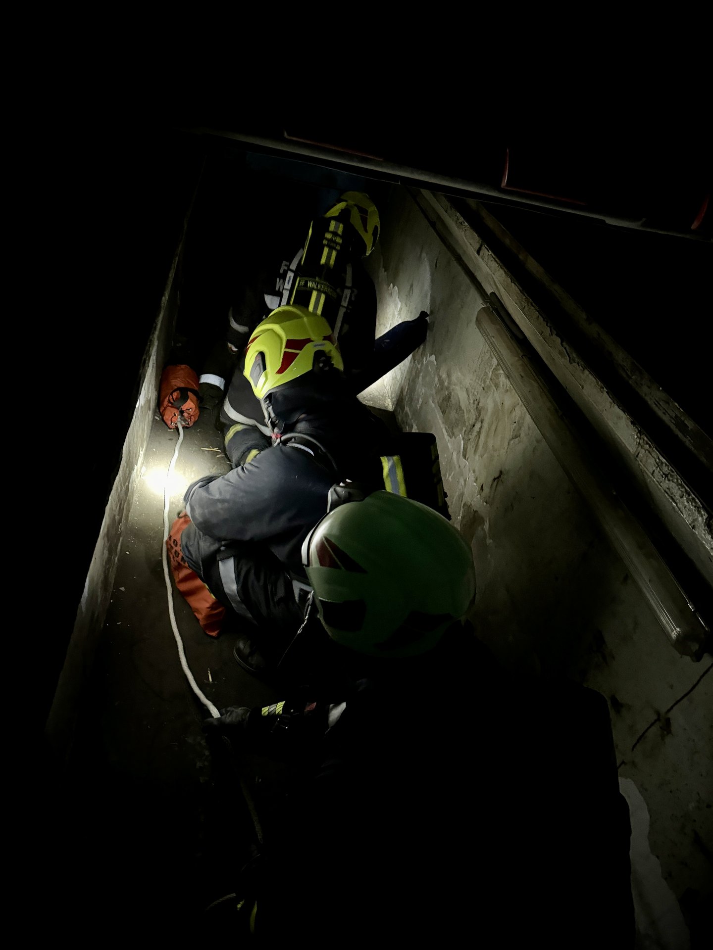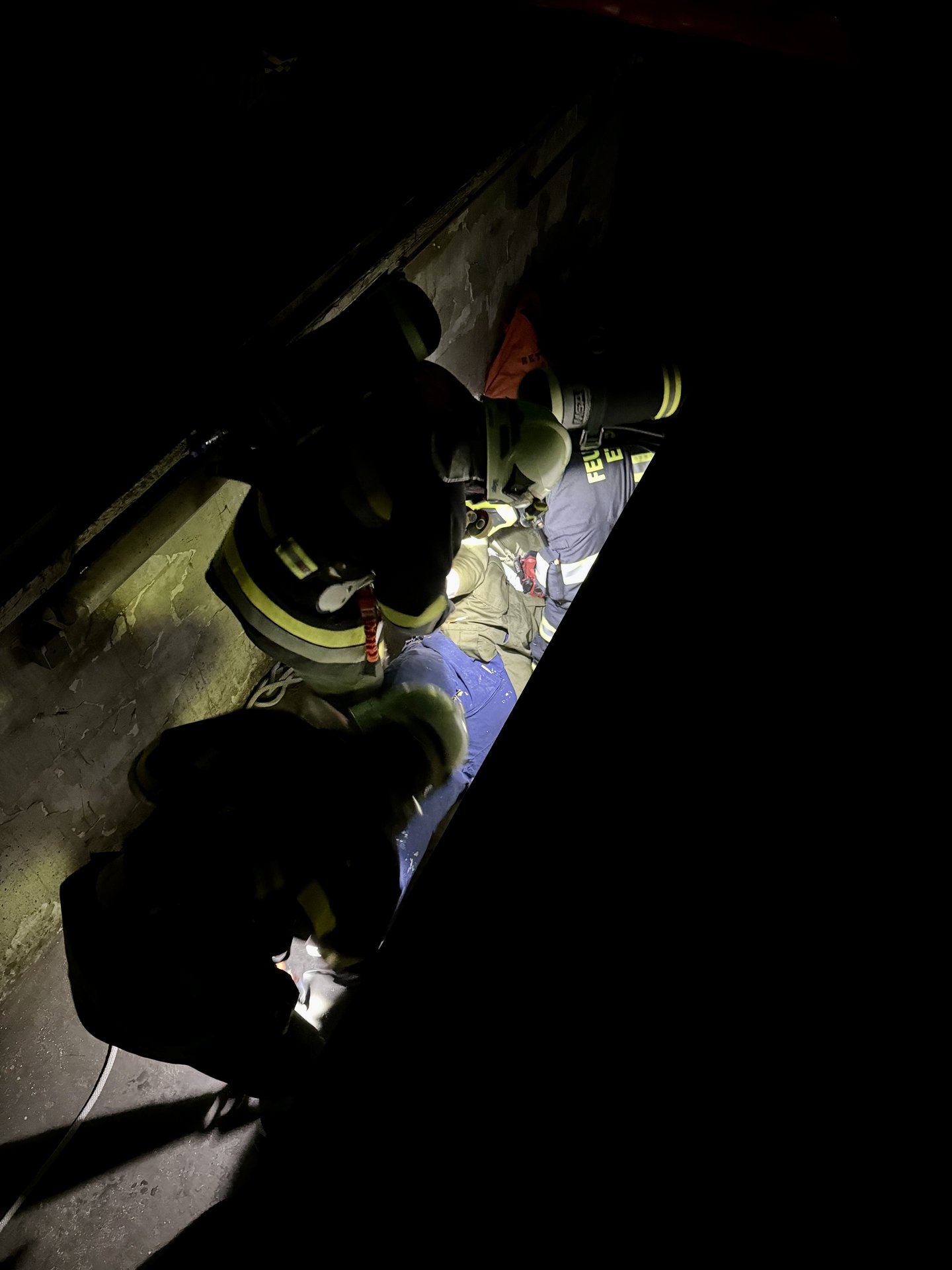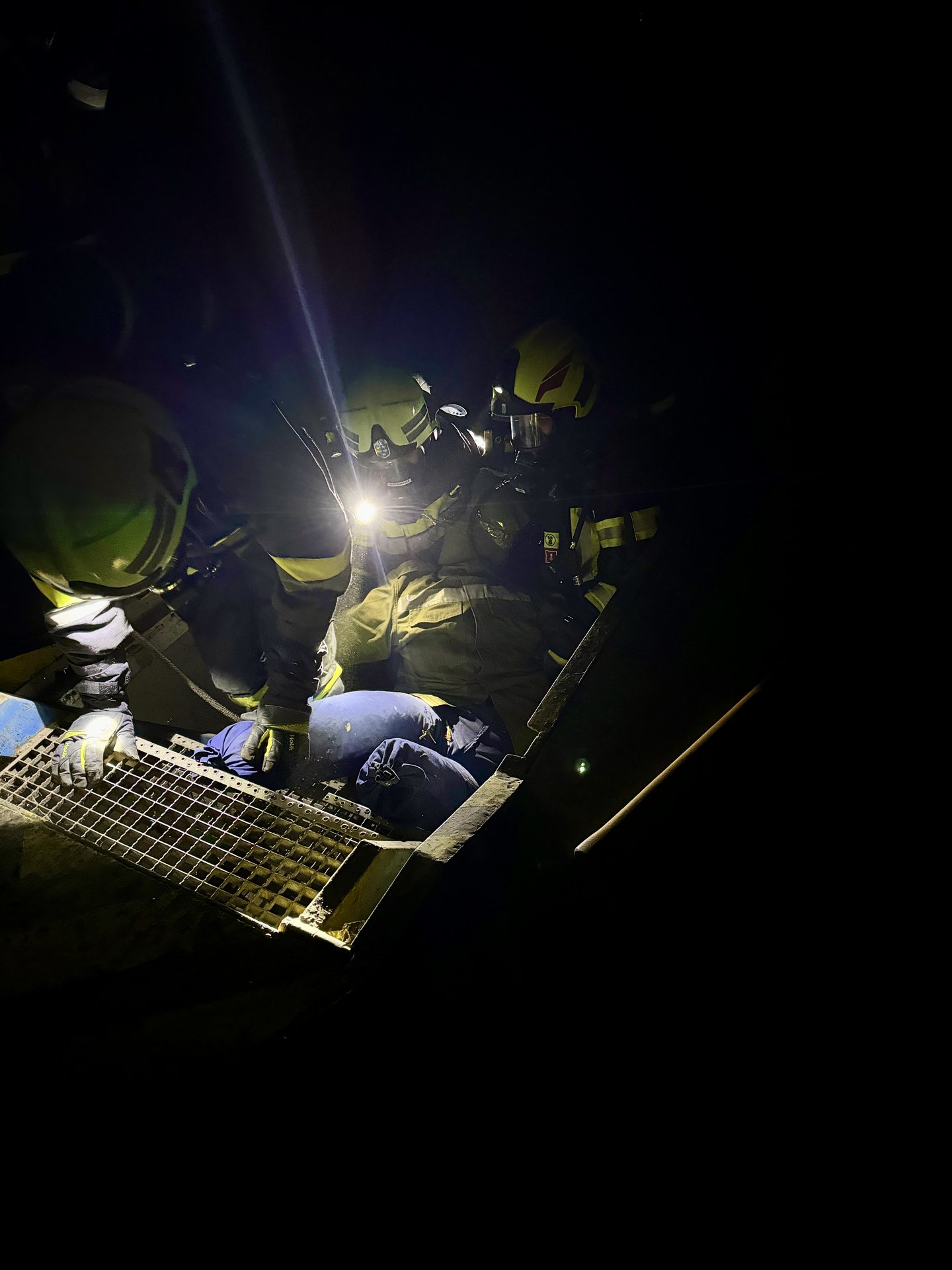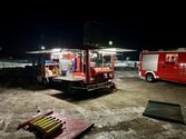 Übungsannahme war, dass in einer Wartungshalle ein Brand ausgebrochen ist und eine verletzte Person in der Montagegrube unter einem LKW vermutet wird. Die Feuerwehrleute mussten mit schwerem Atemschutzgerät ausgestattet, in das Gebäude vordringen, um die Person zu retten.