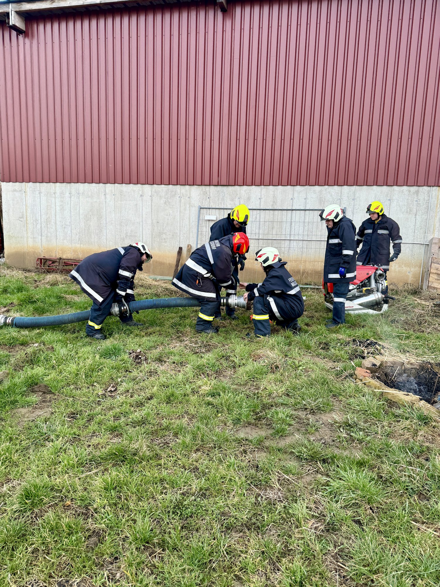 Die Übung begann mit einem Brandszenario, bei dem die Feuerwehrleute ihr Können unter Beweis stellen mussten. Die Aufgabe Bestand darin mit Hilfe von 4 Saugschläuchen Wasser aus einem Brunnen zu saugen und den Brand so effektiv wie möglich zu bekämpfen.